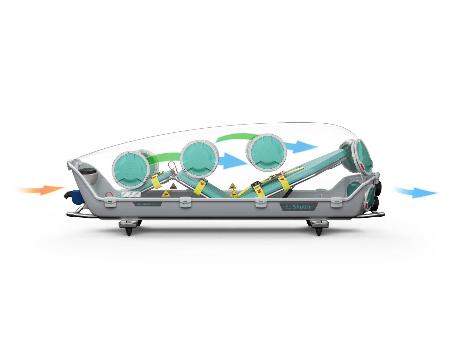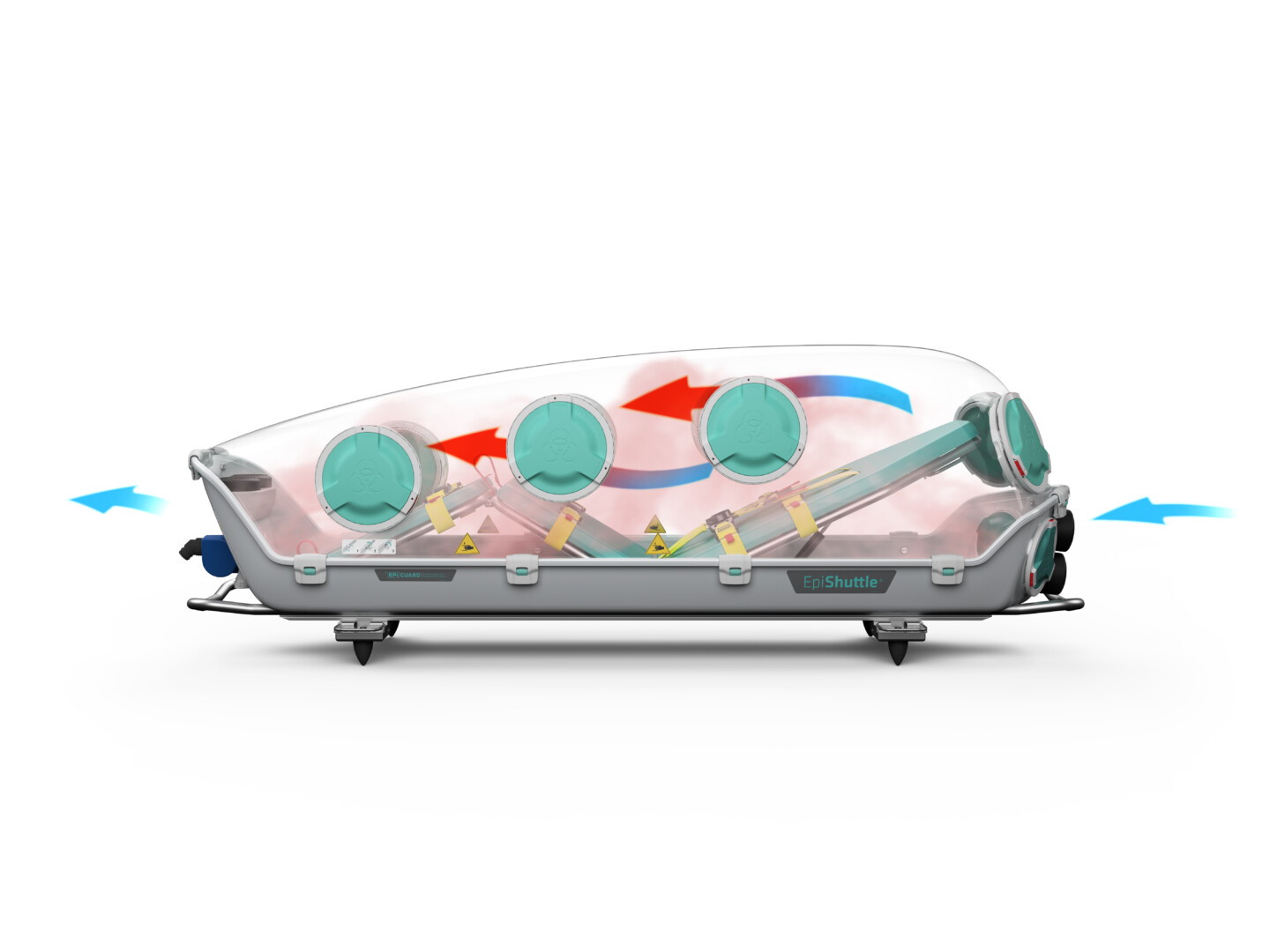 本機は本体に設置された負圧機構と A2P3 フィルトレーションにより周囲の環境からポッド内部の密封状態を維持しています。救急車両、ヘリコプターや固定翼機などへの搭載も仮に航空機内で急減圧が発生しても汚染物質がポッド外に漏れることはがありません。これにより患者を汚染地域から安全に搬出することができます。