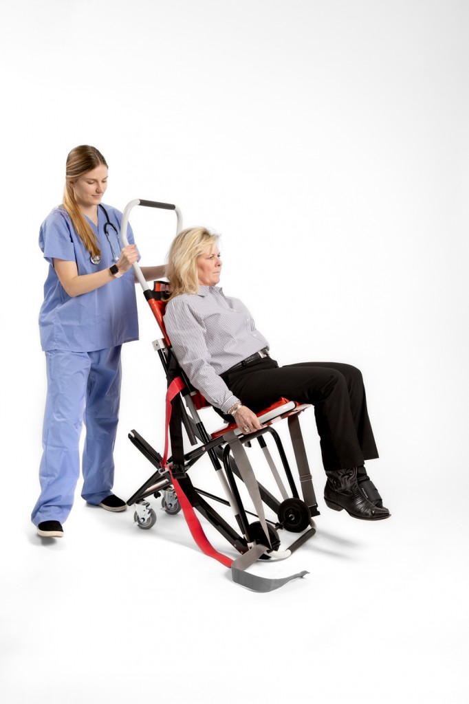 4本の拘束ストラップ、クッション性のあるシート、ドロップダウン式のフットレストを備え、足の不自由な方でも安心して避難することができます。