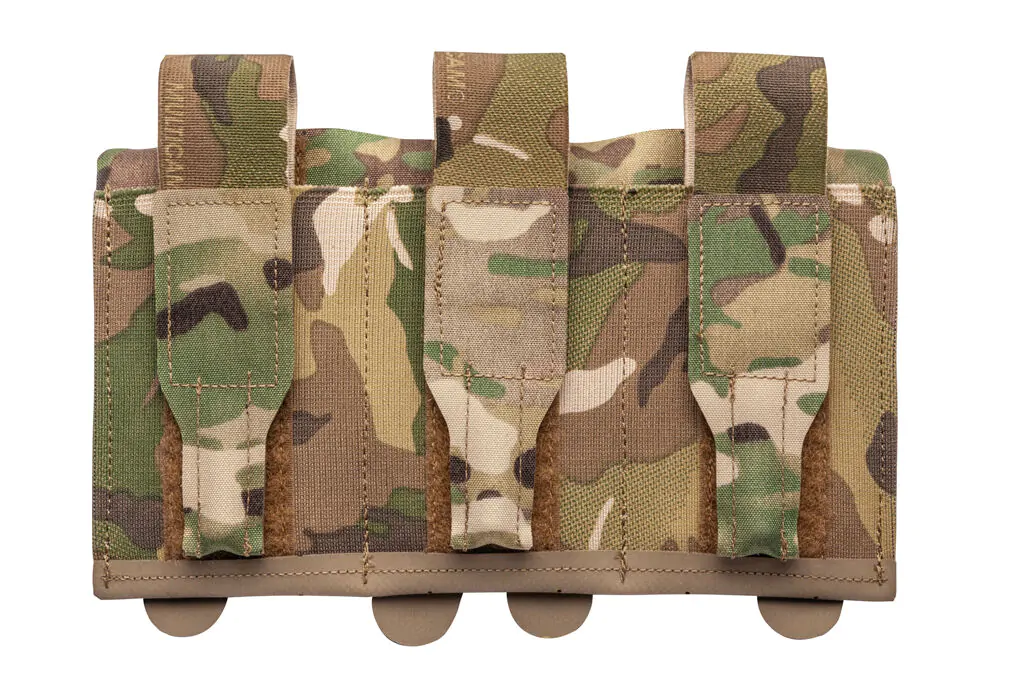 フロントが分割された薄型で軽量なデザインで、うつ伏せのときにも簡単にジッパーを開けることができます。ポーチは4つのマガジンを固定し、各マガジンポーチの前面に追加のMOLLEアクセサリを取り付けることもできます。