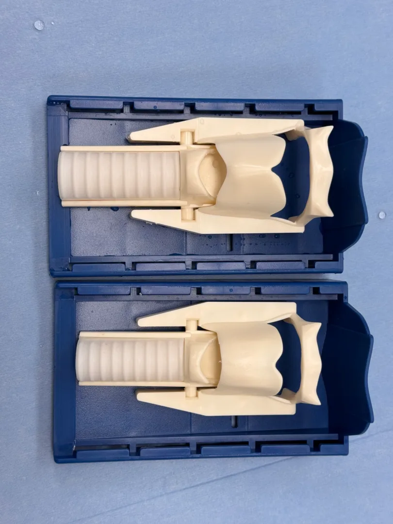 輪状甲状間膜切開トレーニングを革新するポータブルモデル。解剖学的にリアルな胸骨・舌骨・甲状腺・輪状軟骨・気管輪を再現し、3層構造の皮膚によりドライ/ウェット両方で練習可能です。男性・女性モデルがあり、サイズや甲状腺板形状の違いも学習できます。200枚の交換用スキンと予備気管が付属し、繰り返し使用が可能。ABS 樹脂製の高耐久ボディで洗浄も容易、現場や配備先での反復訓練に最適です。