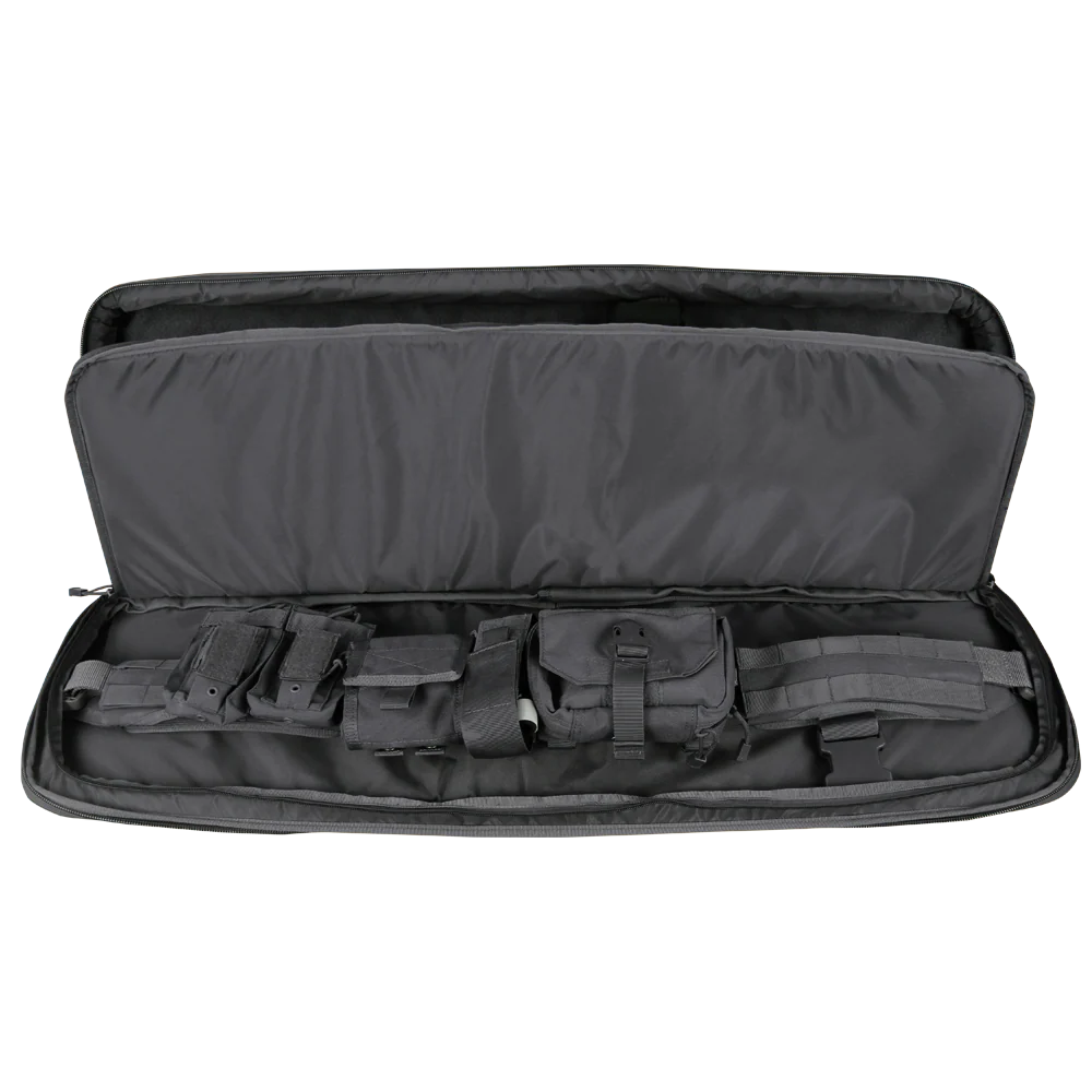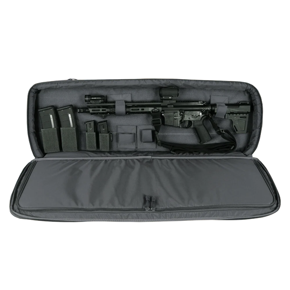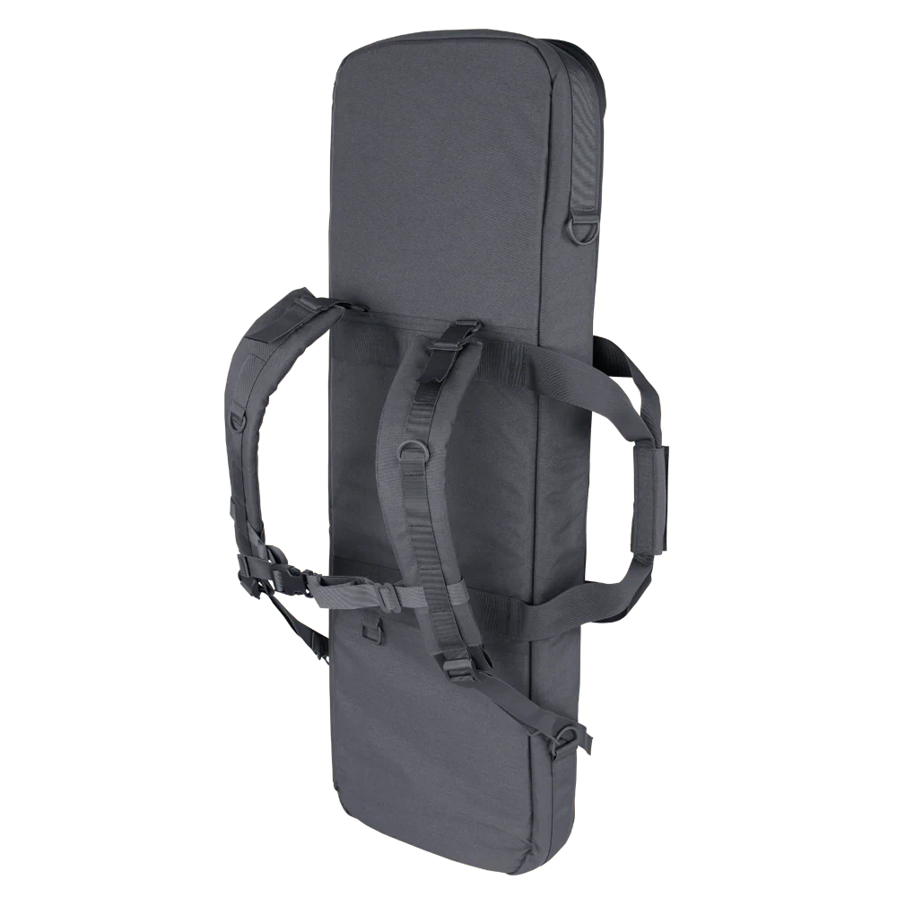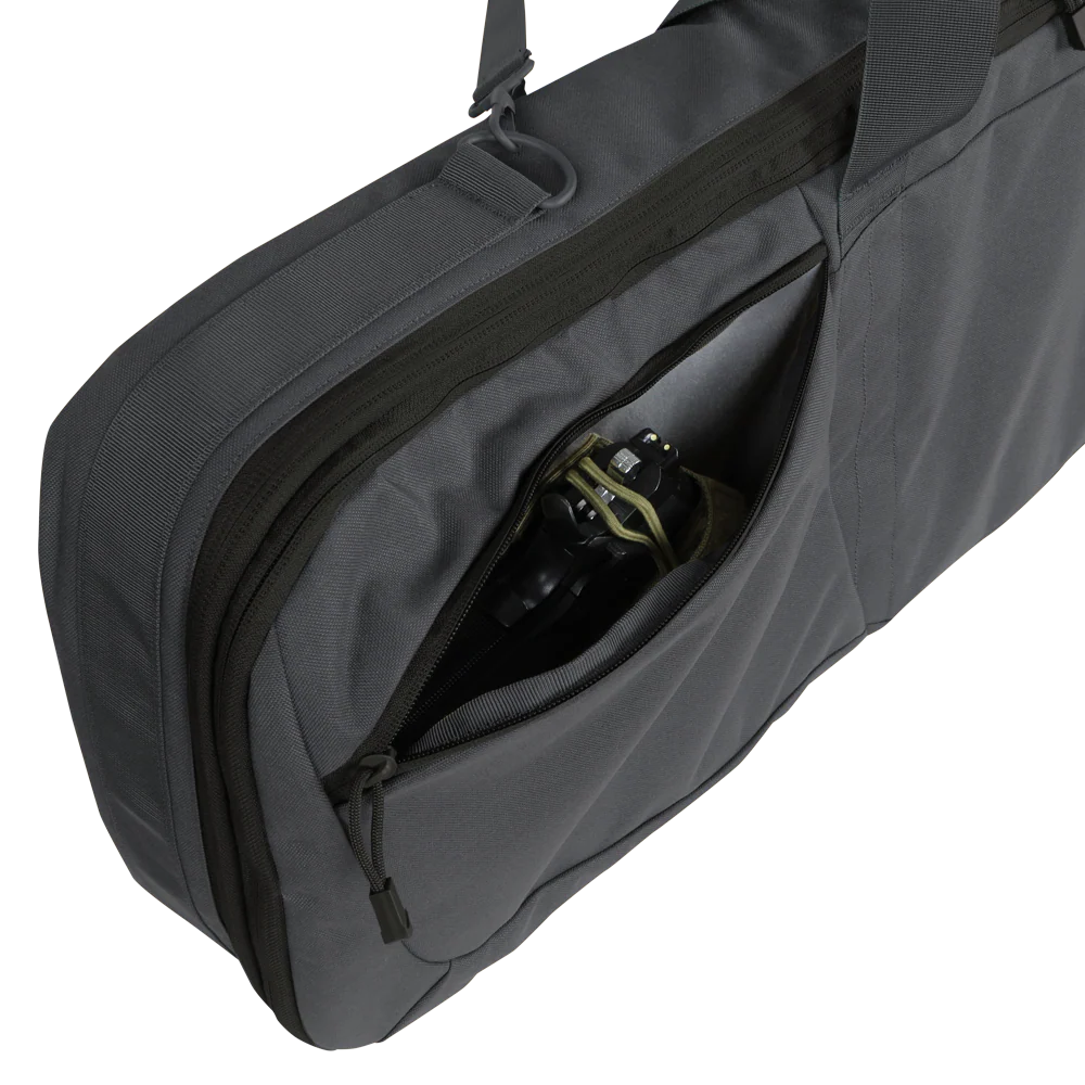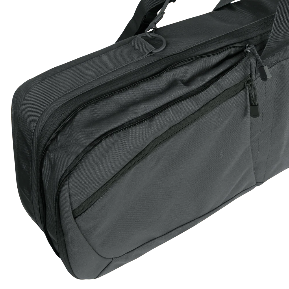 最大91cm のライフルを収納可能なスリム設計。拡張式メイン収納で追加ギアも収められ、内部ストラップが銃を固定します。外部ポケットやロック対応ジッパーを備え、耐衝撃フォームで安全性も確保。無地の外観は都市部でも目立たず、秘匿性と機能性を両立します。