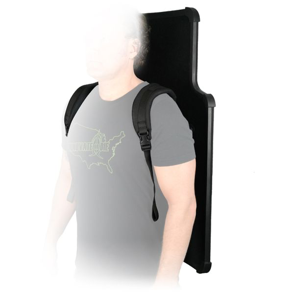 防弾シールド用バックパックストラップシステム。500デニールの Cordura 素材を採用し、疲労を軽減するヨークロードレベラー付き。シールドのフォアアームパッド下にベルクロで装着し、長時間でも快適に運用可能。
