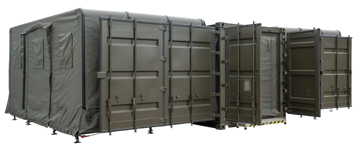 特許取得済みの展開システムを備え、50㎡以上の空間を迅速に構築できるモジュール式多目的コンテナで、軍事・人道支援・民間セキュリティの現場において指揮所、医療、物流、居住、除染など幅広い用途に対応し、2人で短時間に展開可能な高い機動性と即応性を実現します。