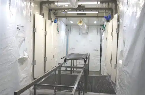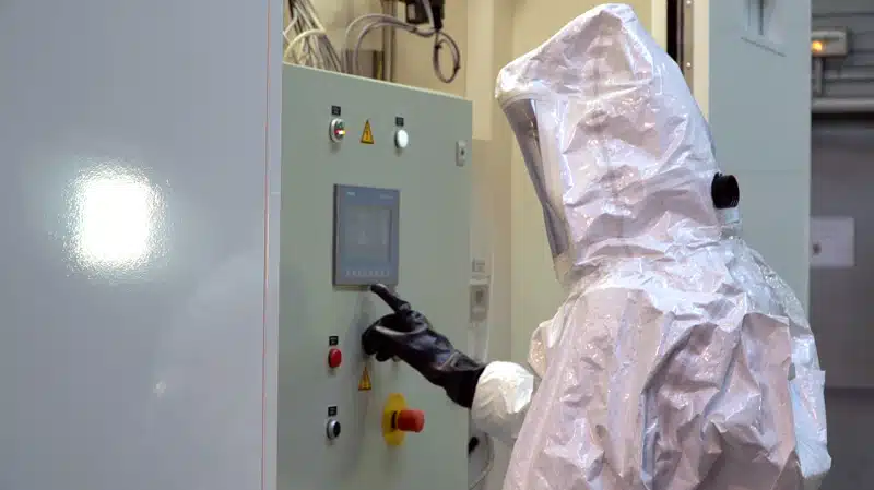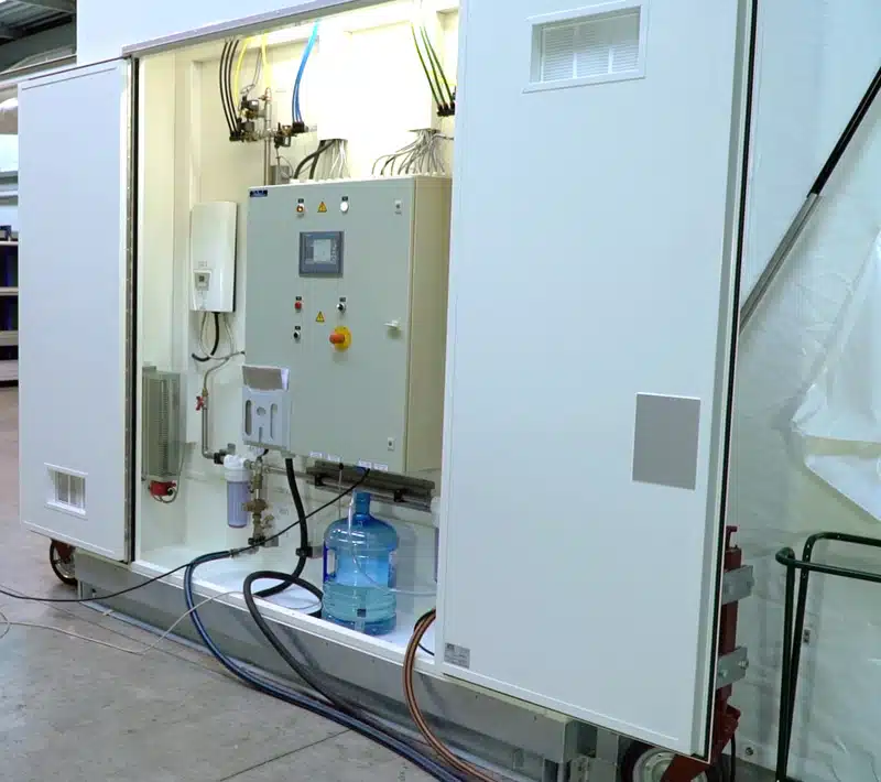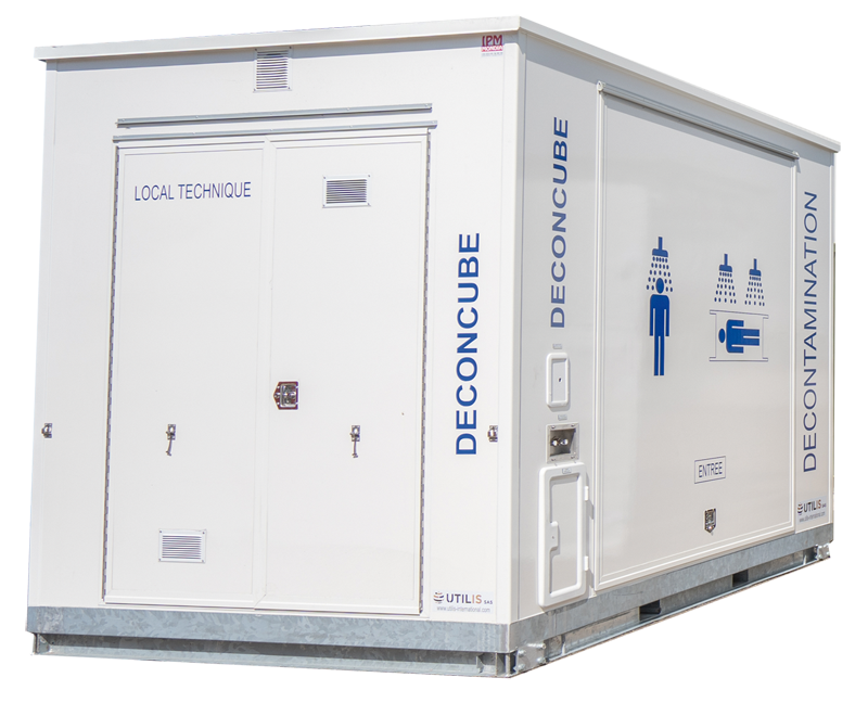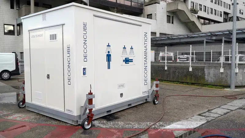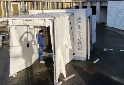 設置面積が小さく、少人数で迅速に運用できることが特徴です。1人で15分あれば、すぐにセットアップでき、2人での運用がが可能です。除染のプロセスは自動化されています。人がドアを通過すると、センサーがそれを感知し、自動で除染サイクルが作動します。除染が完了し、次の段階であるシャワーへ進むべきタイミングは、電球の点灯によって示されます。効率的な設計と自動化機能により、病院内での感染予防や、広範囲な除染作業など、多くの場面での活用が可能です。