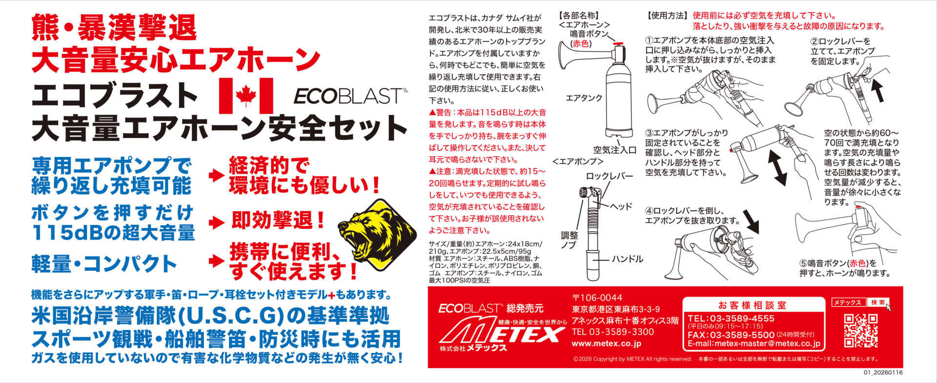 ボタンを押すだけで115dBの大音量報音。大音量で熊を威嚇。専用エアポンプで繰り返し充填可能。