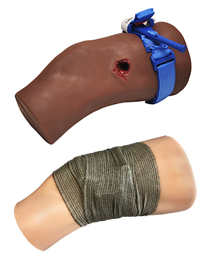 骨、筋肉、脂肪、腱を露出させた完全な切断を再現する着用可能な創傷シミュレーションです。 受傷者役またはマネキンの太腿に巻き付け、フックとループ留め具で取り付けます。