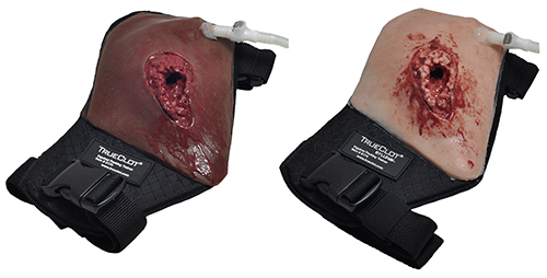 女性の股間への銃創を再現した着用可能な創傷シミュレーションで、露出した筋肉、脂肪、動脈が再現されています。 このデバイスはおむつのように着用します。