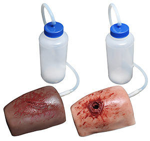 軟部組織の創傷をシミュレートし、学生に適切な創傷パッキング技術を指導するために使用されます。 スキル レベルを高めるために、創傷腔内に硬い骨 (骨折) を配置しています。