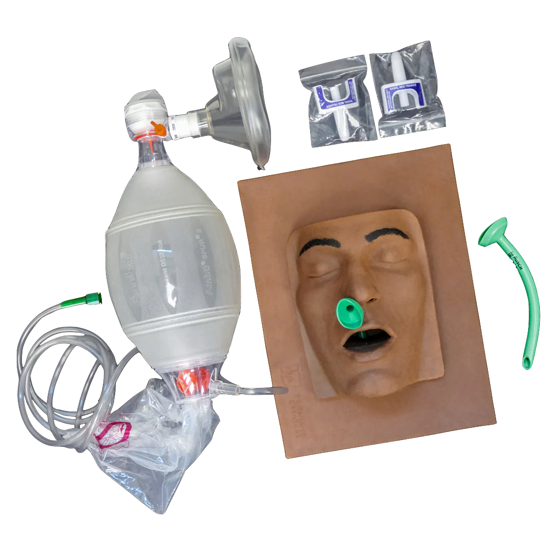 シンプルなデバイスにより、NPA 挿入のデモンストレーションと練習を行うことができます。(NPA デバイスは付属していません)。 ナロキソン (NARCAN は付属していません) の投与のトレーニングにも使用できます。