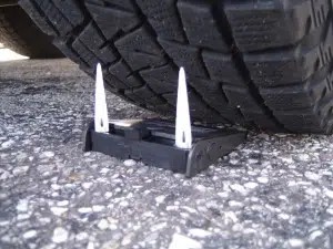 走行している車のタイヤに刺さりパンクさせるマグナムスパイクシリーズ。MS10はシリーズの中の軽量・コンパクトタイプ。スパイク数:100