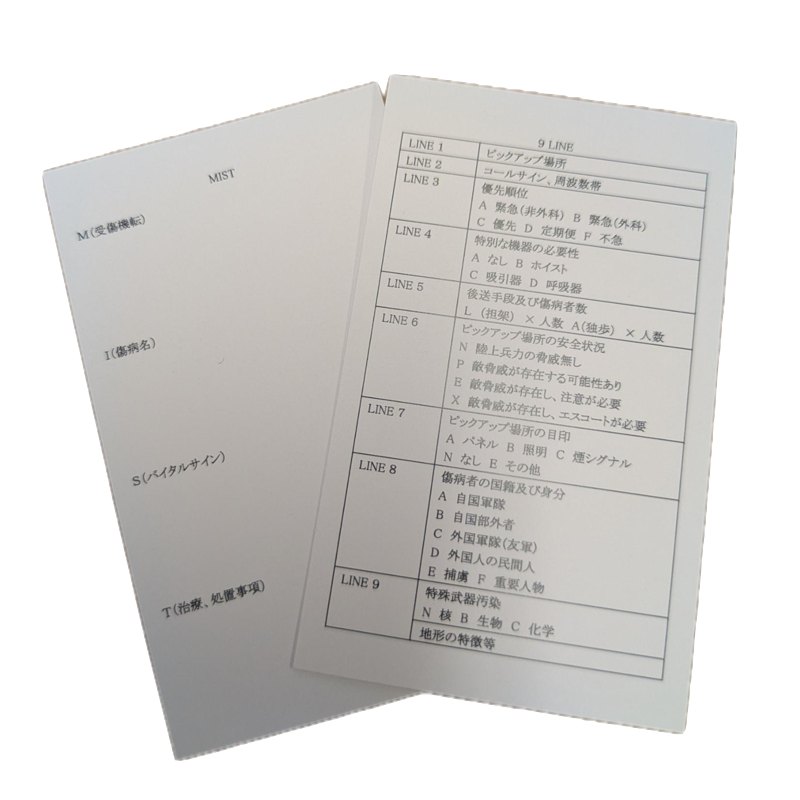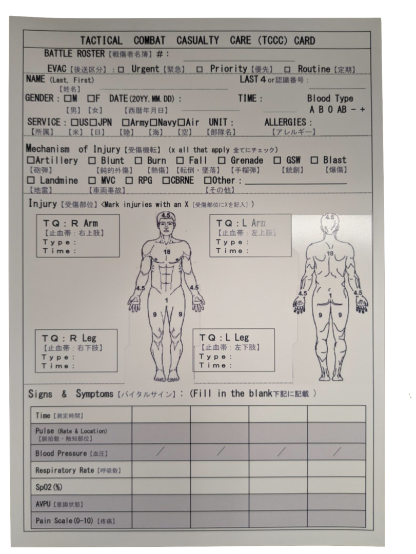 戦術戦闘負傷者ケア (TCCC) 準拠の負傷者カードです。