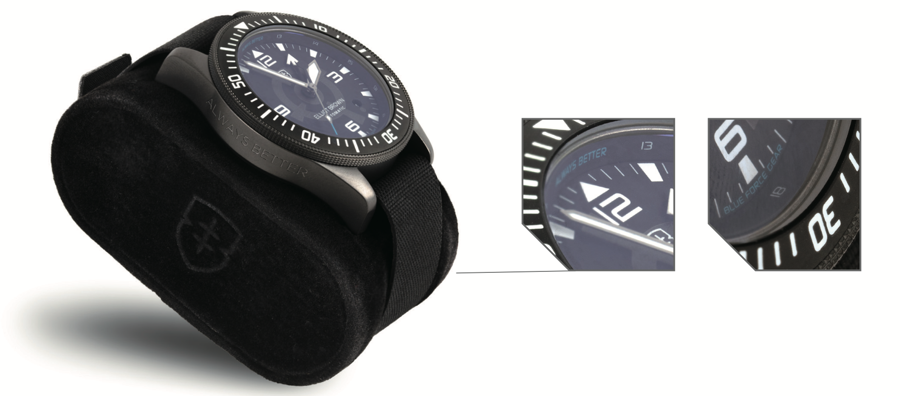 エリオット・ブラウン社製「ホルトン・オートマチックGMT」のBFG限定モデルは、軍・法執行機関向けに開発された本格派自動巻き腕時計。過酷な環境にも耐える堅牢なケースには、Blue Force Gearの信条「Always Better」の刻印と、ブランドを象徴するロゴが文字盤と針に配されています。バンドにはBFG独自のULTRAcompファブリックラミネートを使用。細部にまでこだわり抜かれた、静かなるプロフェッショナルのための一本です。