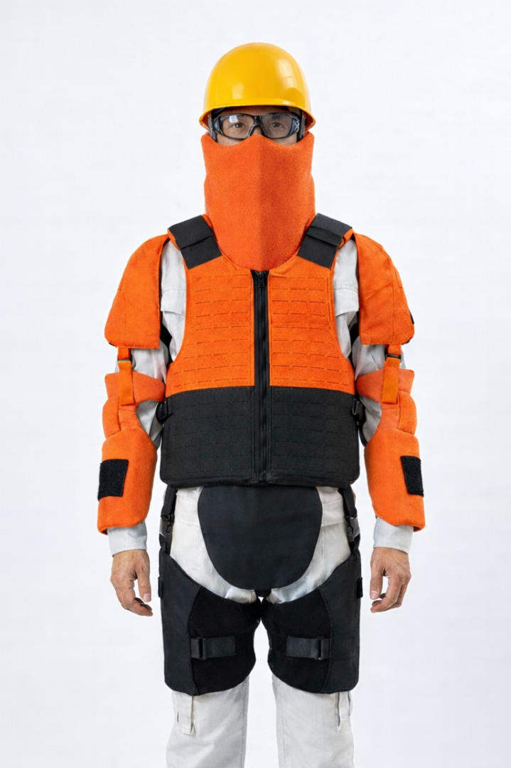 熊対策防護装備の5点セット。首、体幹、肩、腕、鼠径部と体の大部分を覆うことができます。防刃性能も兼ね備えています。